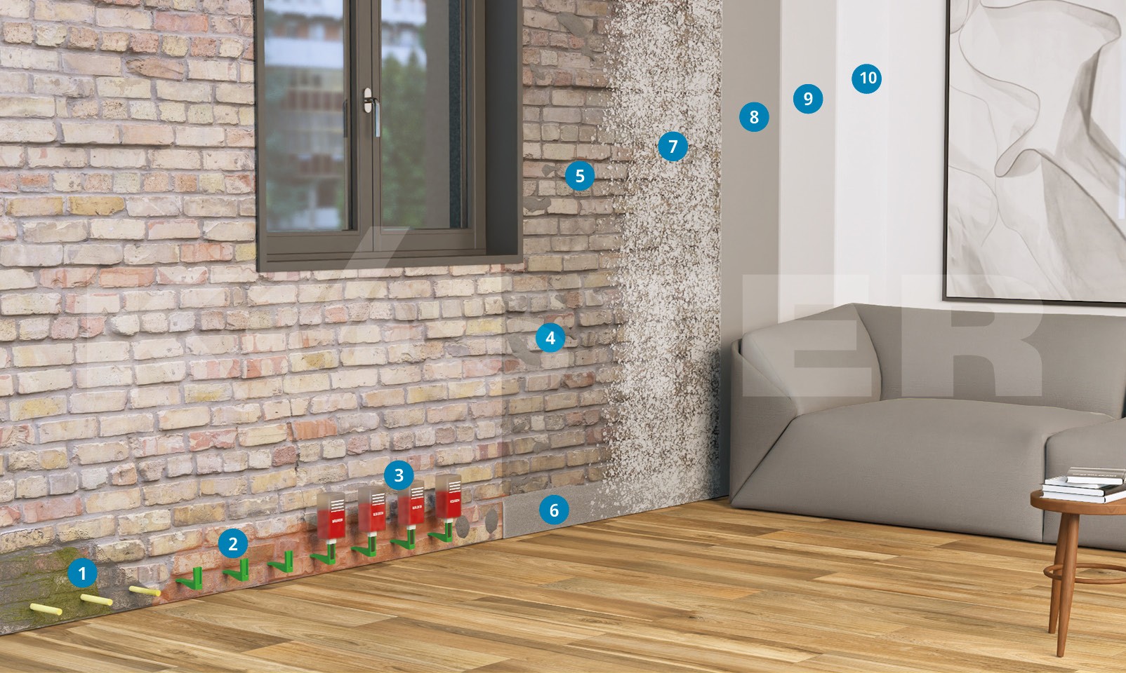 V prípade že je poškodenie spôsobené vzlínajúcou vlhkosťou, musí byť zo steny odstránená stará omietka. Po inštalácii horizontálnej bariéry je potrebné použiť sanačnú omietku KÖSTER Restoration Plaster. Sanačná omietka KÖSTER Restoration Plaster umožňuje murivu uschnúť bez poškodenia. Sanačné omietky KÖSTER Restoration Plasters umožnujú difúziu vodných pár a sú hydrofóbne. Soli, ktoré zostali v stene sú absorbované sanačnou omietkou KÖSTER Restoration Plasters, takže soľ netvorí výkvety na povrchu a nepoškodzuje omietku ani maľovku.
