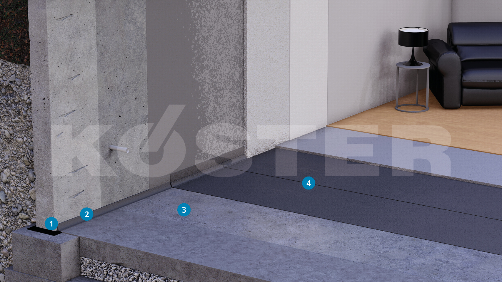 Plošná hydroizolácia je zvyčajne vytvorená z KÖSTER NB 1 Grey zmiešaného s KÖSTER NB 1 Flex. V prípade potreby veľmi rýchlej aplikácie, je potrebné použiť materiál KÖSTER NB 1 “Fast”. V prípade tlakovej vody, musí byť izolácia zhotovená KÖSTER KD Systémom. Na ochranu povrchu je ideálny samonivelačný materiál KÖSTER SL Premium.