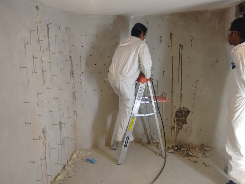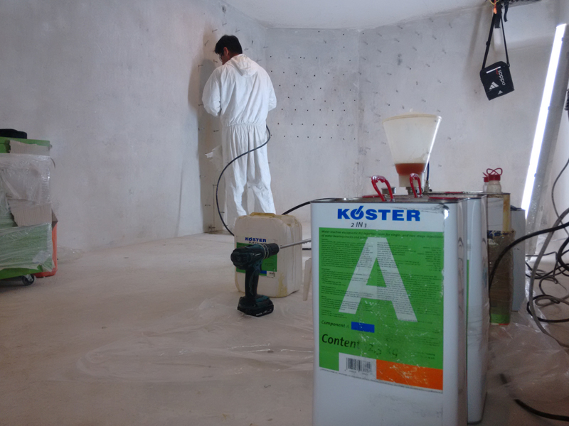 Pressure injection of water bearing cracks with KÖSTER 2 IN 1 and KÖSTER NB 1. Subsequently the floor and the wall were painted with KÖSTER MF 1.